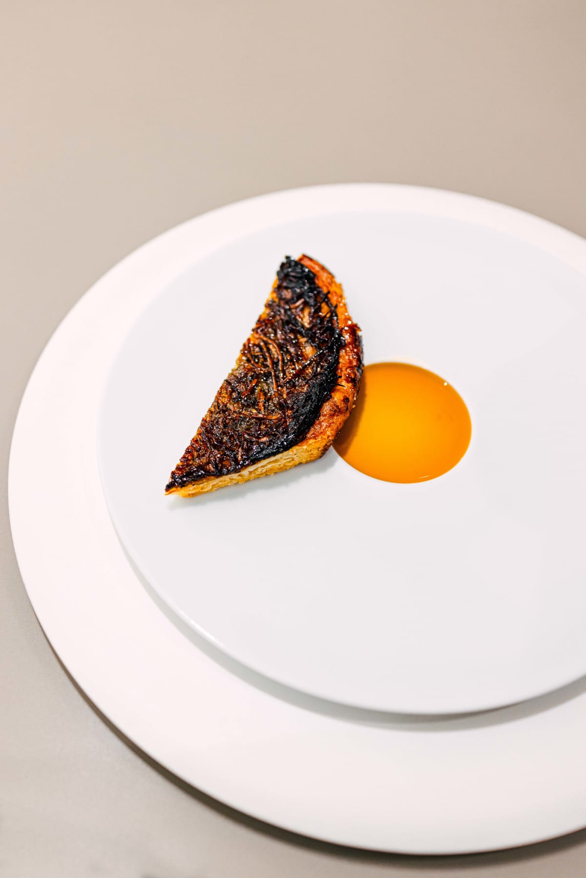 The burdock pie that arrived between courses was the one sequence in the meal where the kitchen's intelligence felt slightly disconnected. The form was interesting: a whole pie constructed around burdock, presented intact before being divided and served. But it sat awkwardly in the flow, adjacent to nothing before or after it with obvious intention. The accompanying skin-juice sauce, which was meant to contribute something, was so dominated by the pie's own texture and flavour that I finished the course without fully registering what the sauce was supposed to be. The one moment of the evening that felt unresolved.