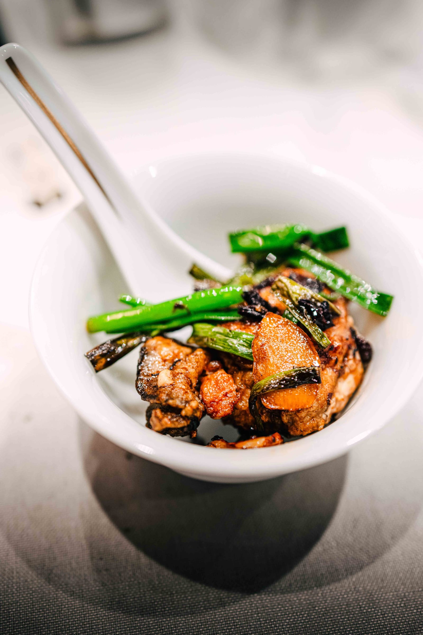 FRAGRANT CHILI ALASKAN KING CRAB with CRISPY CHEUNG FUN was one of the two best courses of the evening. King crab in a fragrant chili sauce is good wherever you encounter it. The variable here was the cheung fun, a rice noodle roll that had been fried until its surface shattered. Cheung fun in its usual context is soft, slippery, a dim sum staple. Here it absorbed the chili sauce as you ate and the combination of textures and heat was unexpected and excellent. I had not previously thought much about cheung fun as an ingredient. I think about it now.